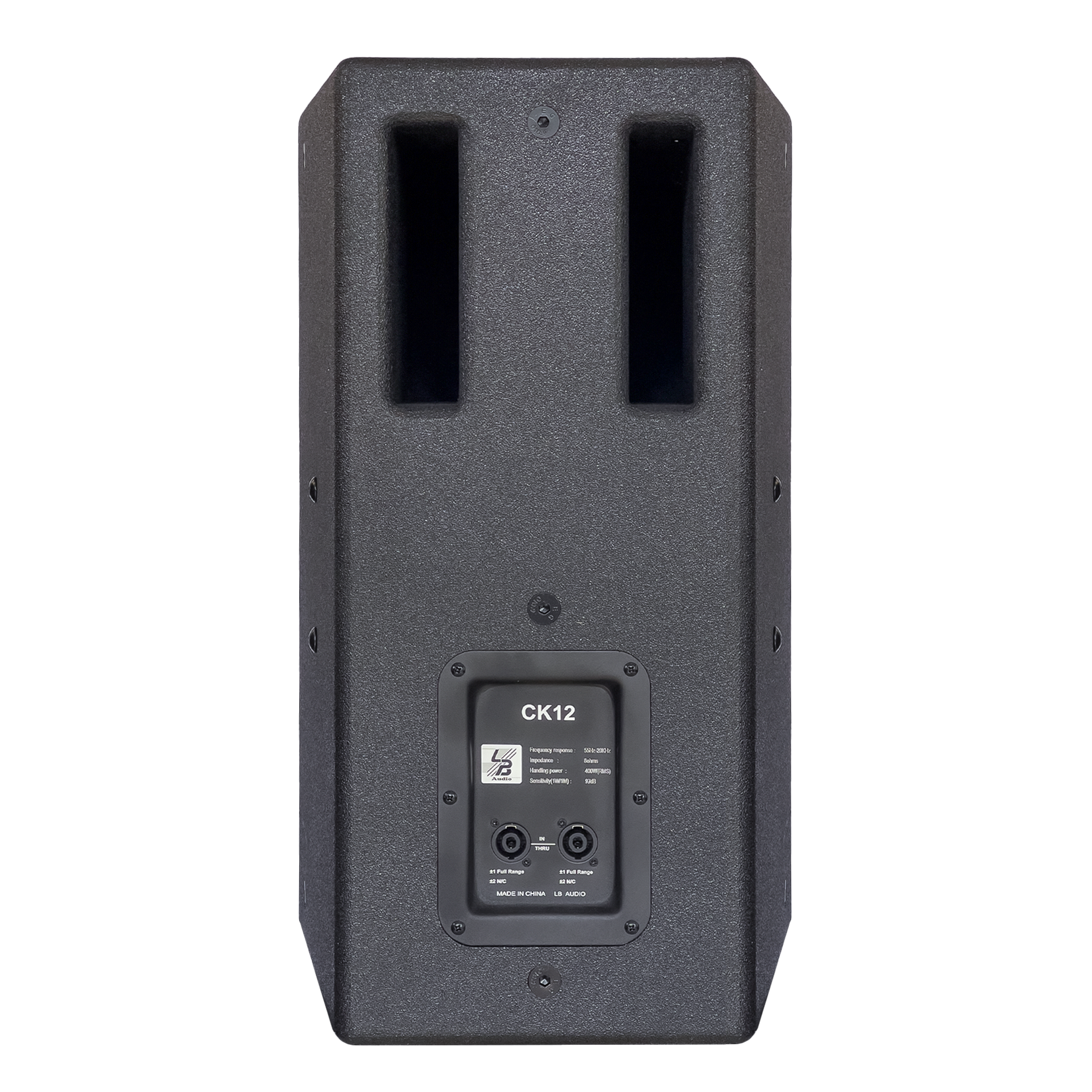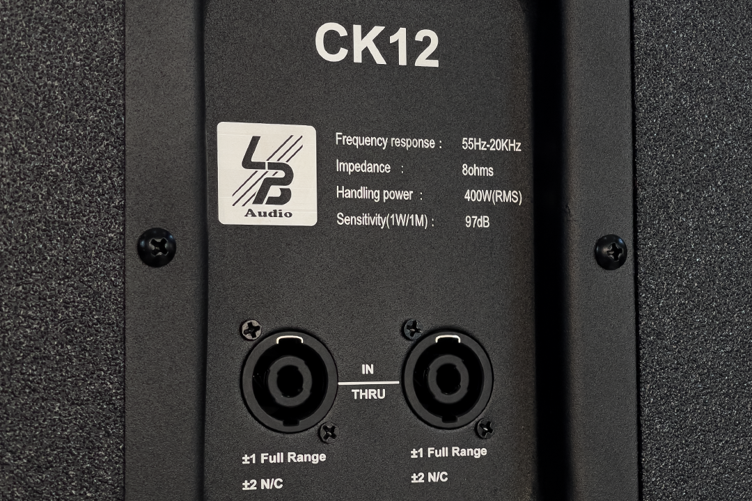 Vỏ thùng loa làm từ gỗ ép đa lớp phủ sơn Polyurea cao cấp, chống trầy xước, chống ẩm và va đập tốt. Thiết kế chuyên nghiệp với logo xoay 360°, lỗ thoát hơi phía sau và cổng kết nối 2 × Speakon NL4M (Input & Link) giúp CK12 dễ dàng lắp đặt trong nhiều kiểu setup khác nhau, từ karaoke gia đình đến hệ thống âm thanh kinh doanh.